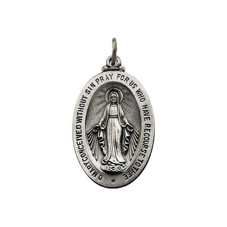 13/16" Sterling Silver Miraculous Medal Made in the USA. The Oval Shape with Wing Sided and Heart Topped Border is Adorned with finely detailed Blessed Mother Mary with rays coming out of her extended hands. The Reverse Side of the Medal Portrays an "M" with a Cross on the top and the "Sacred Hearts" underneath surrounded by Twelve Stars.